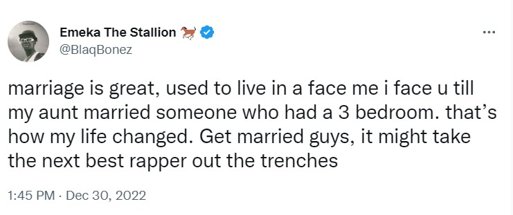 He wrote: “Marriage is great, used to live in a face me I face u till my aunt married someone who had a 3 bedroom. that’s how my life changed. Get married guys, it might take the next best rapper out the trenches”.