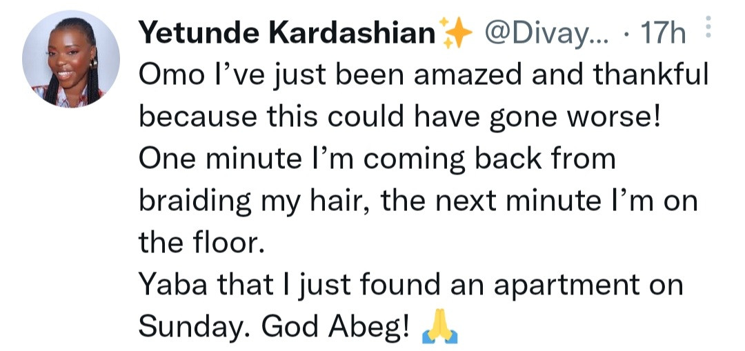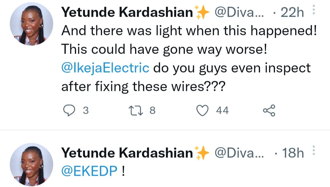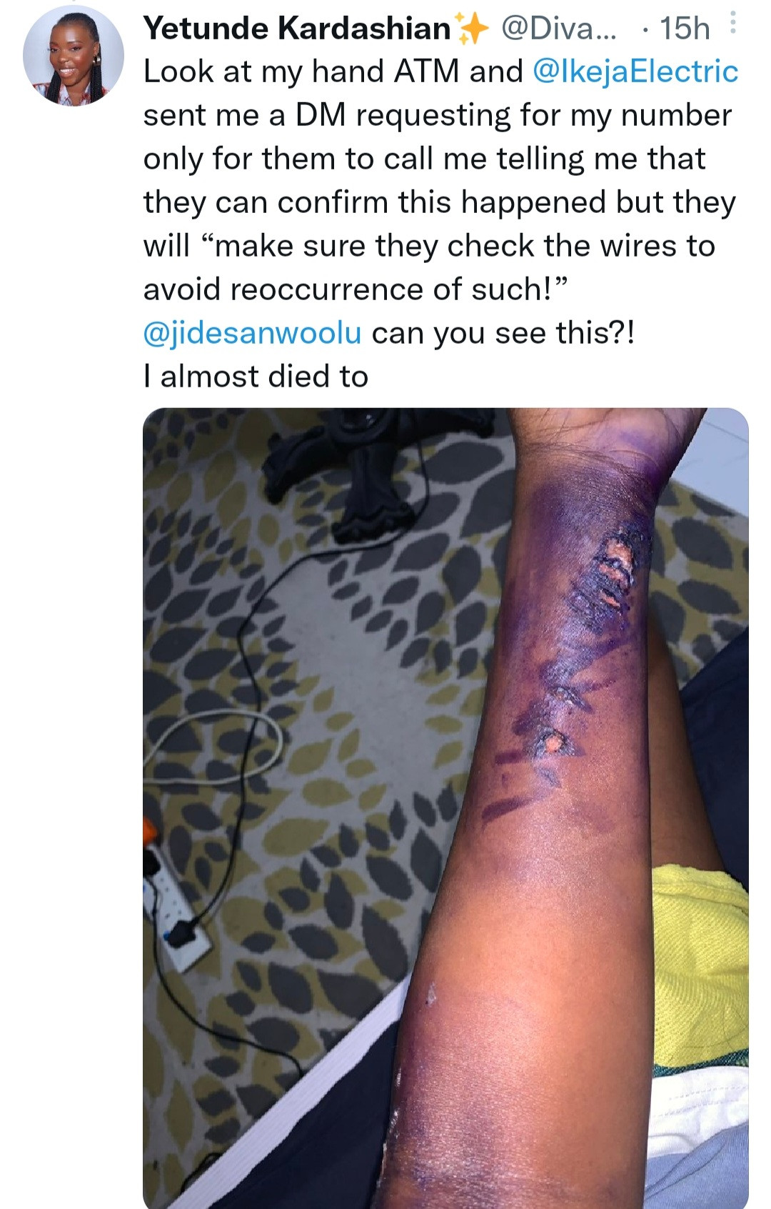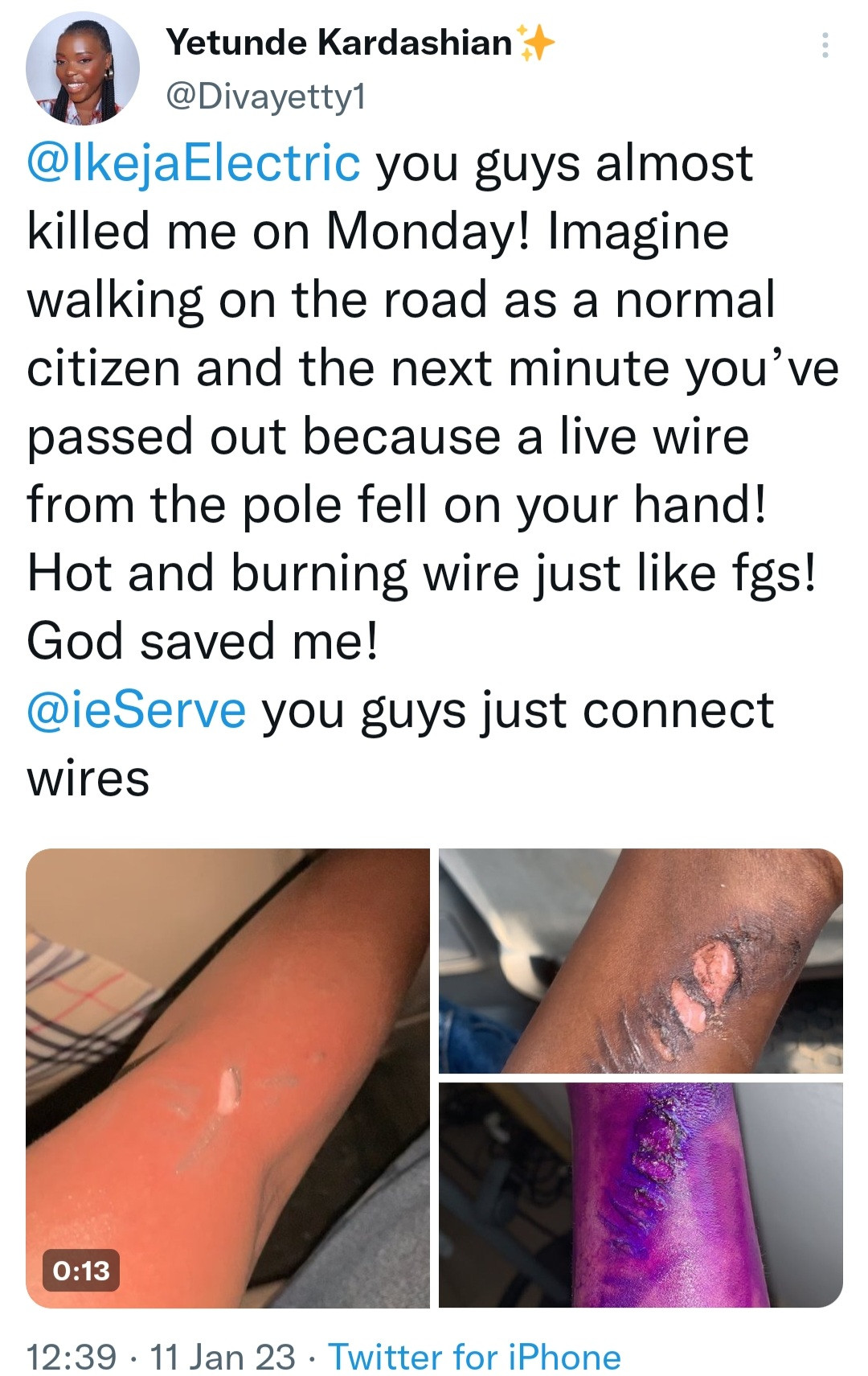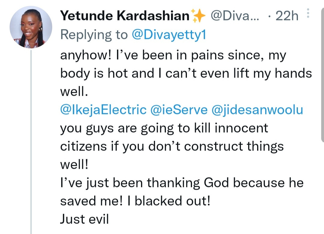 She wrote: “@IkejaElectric you guys almost killed me on Monday! Imagine walking on the road as a normal citizen and the next minute you’ve passed out because a live wire from the pole fell on your hand! Hot and burning wire just like fgs! God saved me!