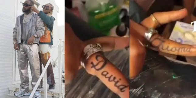 Award-winning singer, Davido and his wife, Chioma Rowland who have been living a low-key lifestyle, have gotten tatoos of each other names on their ring finger.