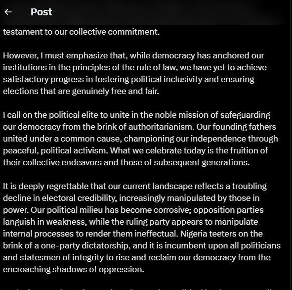 “Nigeria teeters on the brink of a one-party dictatorship, and it is incumbent upon all politicians and statesmen of integrity to rise and reclaim our democracy from the encroaching shadows of oppression.