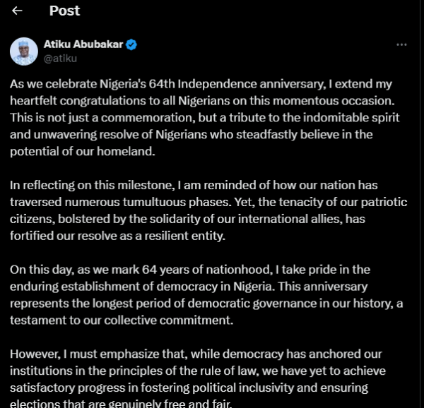 Atiku raised the alarm in a tweet via his X handle, amid celebration of Nigeria’s 64th Independence Day anniversary on Tuesday.