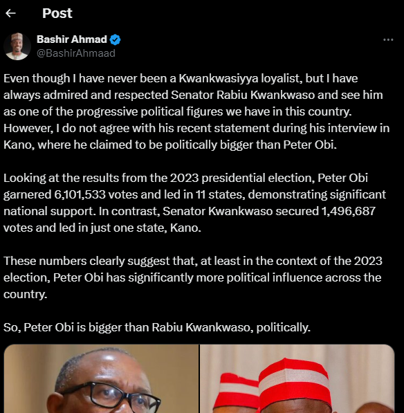 A former media aide to ex-President Muhammad Buhari, Bashir Ahmed, has claimed that the presidential candidate of the Labour party, in 2023 election, Peter Obi is bigger than Rabiu Kwankwaso, politically.