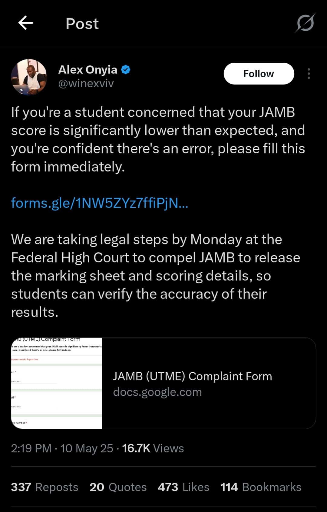 A user identified as @winexviv called on candidates who suspect their UTME results were either tampered with or sent in error to fill out a form that would enable legal action.